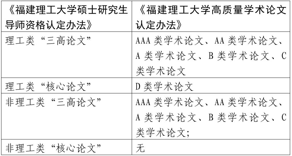 2.《福建理工大学硕士研究生导师资格认定办法》与《福建理工大学高质量学术论文认定办法》中关于论文级别对应关系如下(仅用于本年度硕士研究生导师认定工作):