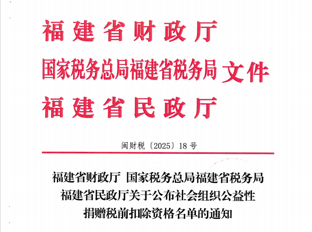 近日,根据福建省财政厅、国家税务总局福建省税务局、福建省民政厅联合印发的《关于公布社会组织公益性捐赠税前扣除资格名单的通知》(闽财税〔2025〕18 号),福州市马尾区阳光教育发展基金会成功入选 2025-2027 年度符合公益性捐赠税前扣除资格的公益性社会组织名单。
